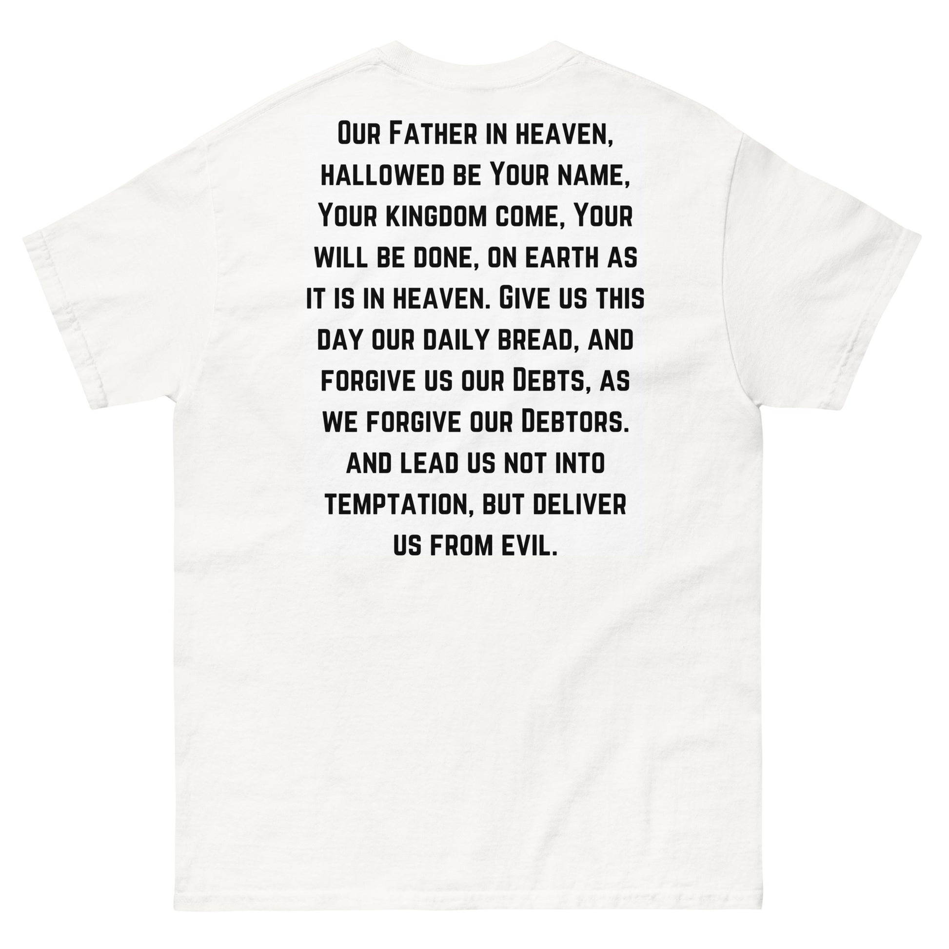 This 100% authentic cotton t-shirt, is a part of the (Our Father collection). It is a great way to spread the word of God, while also reminding you to trust in the lord at all times. This t-shirt fits nicely on the body and it goes perfectly with layered streetwear outfits. It allows you to be comfy and fashionable all at the same time.